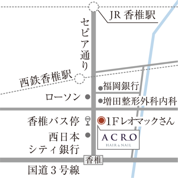 ACROは、お車や公共機関でのアクセスも良い香椎地区の中心エリア「セピア通り」沿いにあります。大きな窓から四季の移り変わりを眺められる場所にあり、お客さまに長く通っていただけるようなサロンを心がけています。